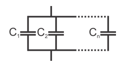 其中 C eq是電容器并聯(lián)連接的等效電容,V 是通過輸入線施加到電容器的電壓,Q 1到 Q n表示存儲在每個相應電容器中的電荷。這給我們帶來了一個重要的結論: